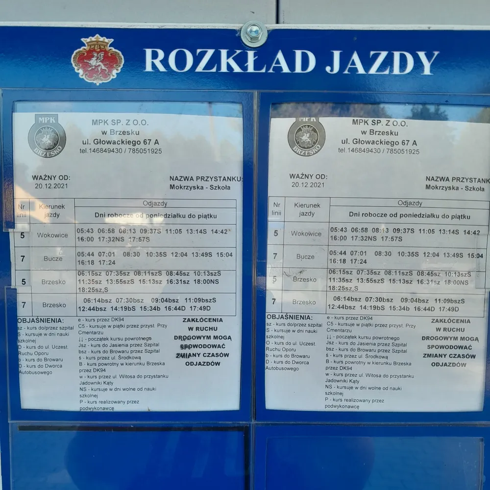 Brzesko Centrum- 06:09(7) 06:14S(Sol2) 06:15(5) 06:27S(Sol1) 06:38DH(MJ) 07:15s(Sol3)07:20(7) 07:20S(Sol1) 07:35(5) 08:02Dm(Sol1) 08:11S(5) 08:15DH(MJ) 08:45(5) 08:55Dm(Sol3) 09:04(7)09:48DH(MJ) 10:02S(Sol1) 10:02qmHsu(Sol1) 10:13S(5) 11:07S(Sol2) 11:09S(7) 11:32qmHsu(Sol1) 11:35(5) 11:50S(Sol1) 11:51DH(MJ) 12:20S(Sol1) 12:44(7) 13:20S(Sol1) 13:35qmHsu(Sol2) 13:41DH(MJ) 13:55S(5) 14:00S(Sol2) 14:19S(7) 14:40S(Sol1) 15:02qmHsu(Sol1) 15:13(5) 15:22S(Sol1) 15:34(7) 15:36DH(MJ) 16:10S(Sol2)16:31(5) 16:48DH(MJ) 18:25DH(MJ) 18:25S(5) 18:30Dm(Sol2)