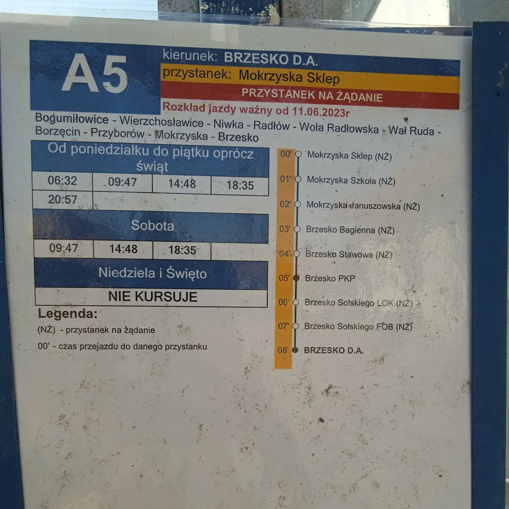 Brzesko PKP- 06:14S(Sol2) 06:26S(Sol1) 06:32 07:14s(Sol3) 07:19S(Sol1) 08:01Dm(Sol1) 08:54Dm(Sol1) 09:47 10:01S(Sol1) 10:01qmHsu(Sol1) 11:06S(Sol2) 11:31qmHsu(Sol1) 11:49S(Sol1) 12:19S(Sol1) 13:11S(Sol1) 13:34qmHsu(Sol2) 13:59S(Sol2) 14:39S(Sol1) 14:48 15:01qmHsu(Sol1) 15:21S(Sol1) 16:09S(Sol2)16:41S(Sol1) 18:29Dm(Sol2) 18:35 20:57